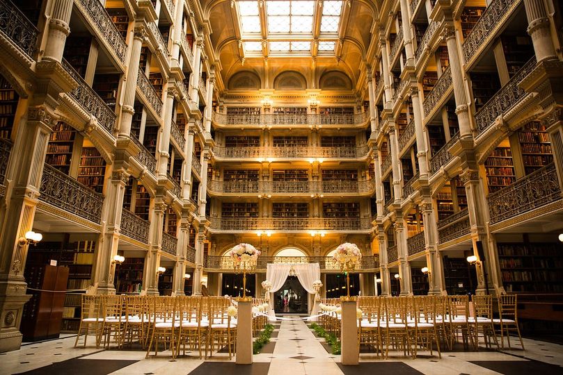 Бібліотека Джорджа Пібоді, яку з любов’ю називають «Балтиморським храмом книг», побудована таким чином, щоб вміщувати 300 000 томів. Бібліотека, збудована в 1878 році балтиморським архітектором Едмундом Дж. Ліндом, вирізняється інтер’єром у неогрецькому стилі з величним атріумом висотою в 61 фут, що увінчується решітчастим вікном з важким матовим склом. Атріум оточений п’ятьма ярусами декоративних балконів чорного чавунного лиття і позолоченими рельєфними колонами.