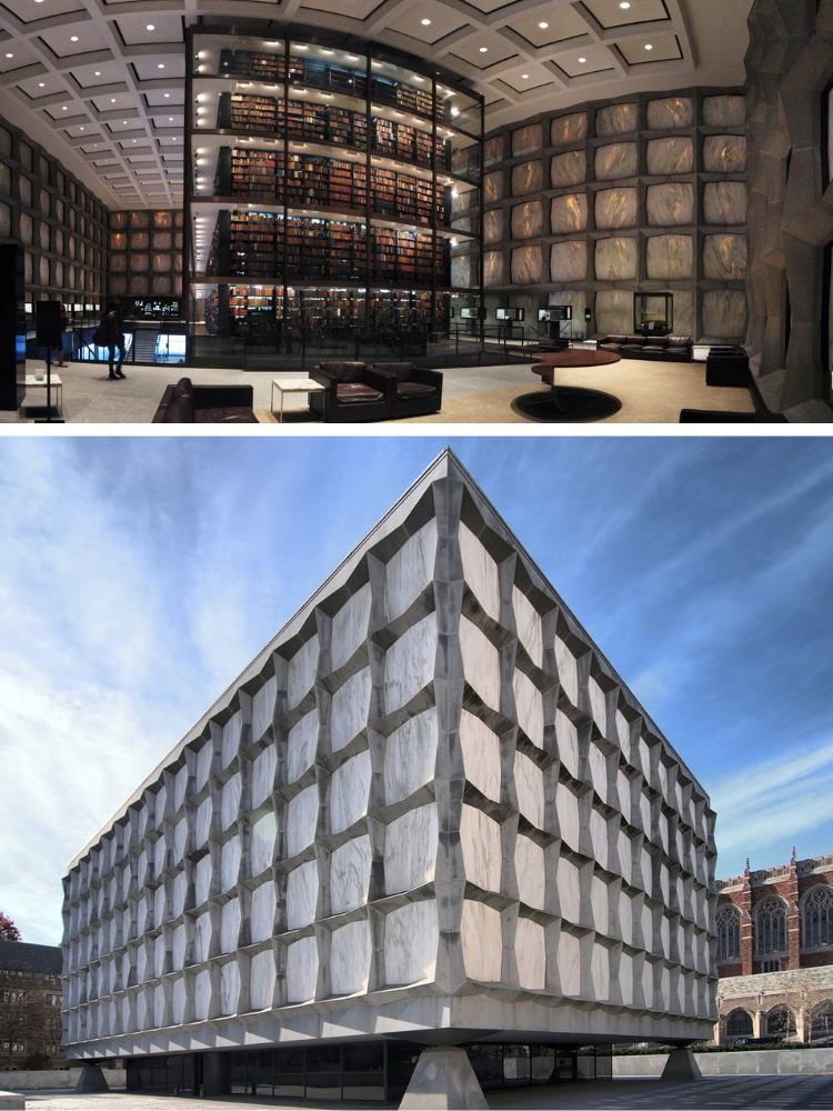 Бібліотека рідкісних книжок і рукописів Бейнеке, яку відкрили в 1963 році, містить колекцію літературних архівів, ранніх рукописів і рідкісних книг Єльського університету. Креативний інтер’єр включає шестиярусну вежу книжкових стелажів за склом, що налічують 180 000 томів. Стелажі створені з матових мармурових панелей, які фільтрують і відбивають природне світло, завдяки чому книжки можна демонструвати, не піддаючи їх загрозі впливу прямих сонячних променів.