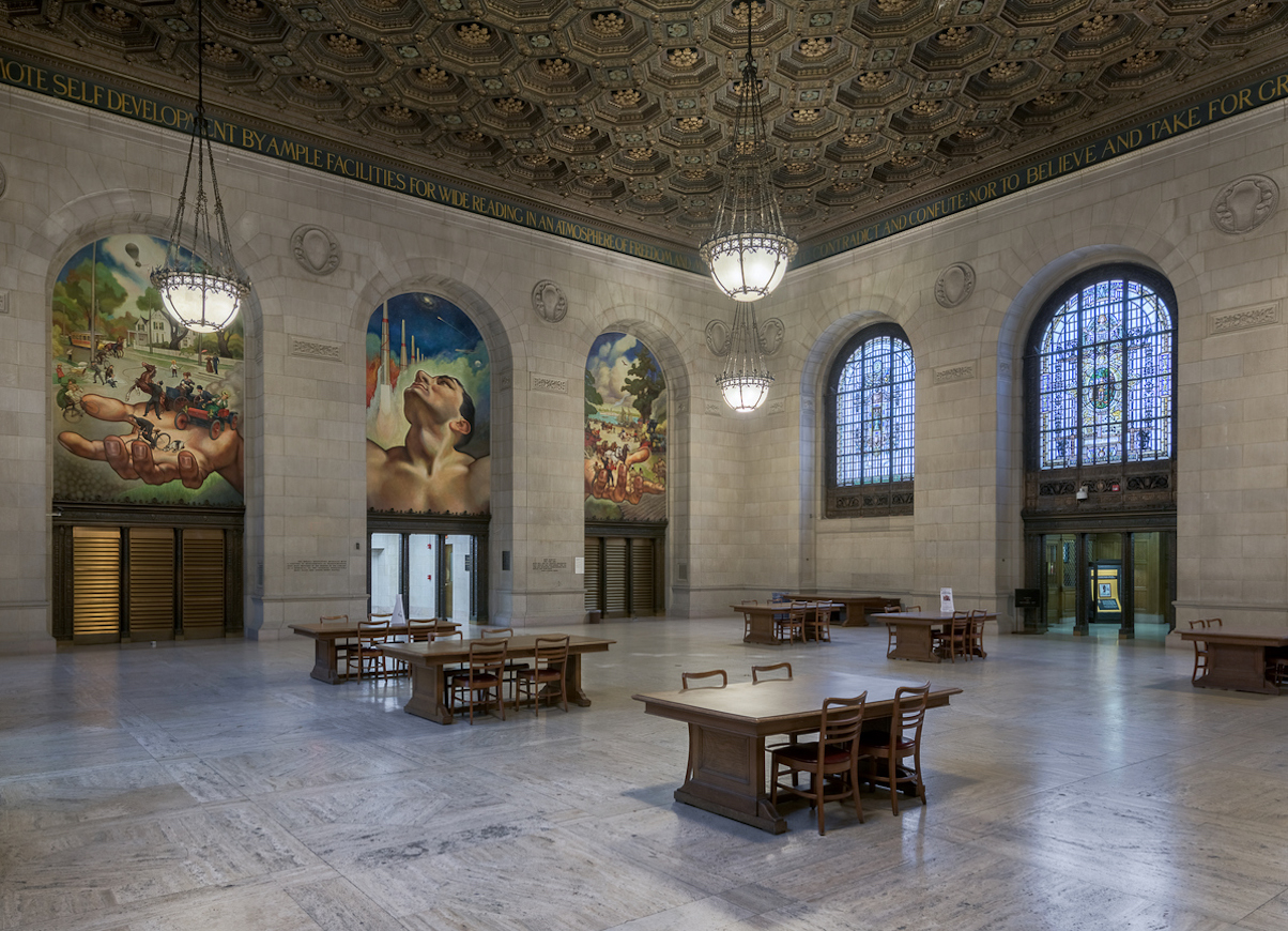 Публічна бібліотека Детройта була спроектована архітектором Кессом Гілбертом у стилі італійського ренесансу. Будівля споруджена з вермонтського мармуру та італійської мармурової стружки, прикрашена величними фресками й мозаїкою, зокрема, роботою Мілларда Шітса «Річка знань»: фреска-триптих зображає ранню історію Детройта, а фреска-триптих місцевого митця Джона Стівенса Коппіна розповідає про історію переселення. Центральна бібліотека належить до історичного центру Детройта, що включений в Національний реєстр історичних пам’яток.