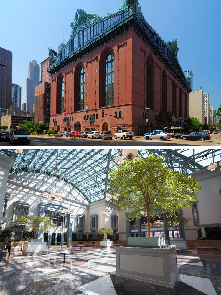 Темно-червона цегла, неокласичний стиль і величні розміри – так можна описати Бібліотечний центр Гарольда Вашингтона. Будівля, в якій розташована центральна бібліотека системи публічних бібліотек Чикаго, має загальну площу близько 972 000 квадратних футів. Споруда з граніту і цегли увінчана фронтонами зі скла, сталі та алюмінію, дах прикрашений сімома фарбованими алюмінієвими акротеріями й медальйонами із зображенням Церери, римської богині родючості.