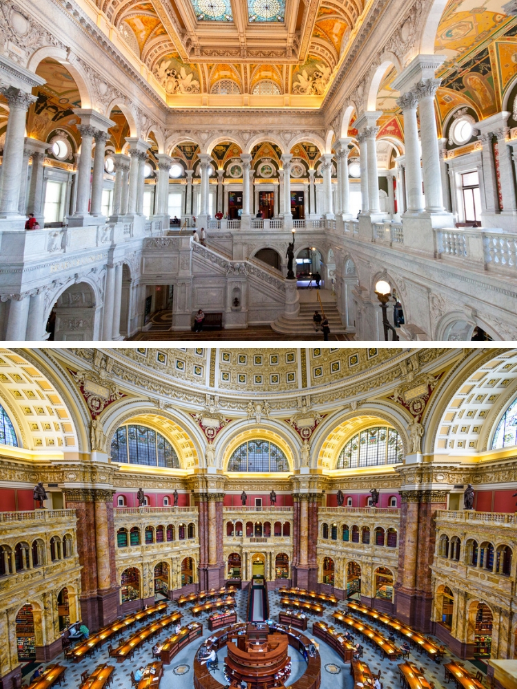 Відвідувачі знайдуть в Бібліотеці конгресу, найстарішій федеральній установі Сполучених Штатів, архітектурні підказки про європейське походження творців американської демократії, Бібліотека відчинила свої двері для відвідувачів у 1897 році, її прикрашають розкішні інтер’єри, створені найкращими скульпторами й художниками Америки. Перлина зовнішнього оздоблення – красномовний фонтан «Суд Нептуна», створений скульптором Роландом Хінтоном Перрі, і дев’ять рельєфних бюстів провідних філософів, письменників і державних діячів.