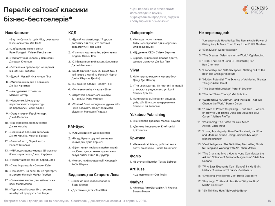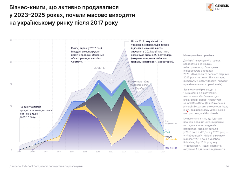 Опитування Genesis Press проводилося з 21 липня до 25 серпня 2025 року. В ньому взяли участь 834 респонденти, що заповнили онлайн-анкету. Категорії бізнес-літератури визначені на основі класифікації IndieBookData, яка базується на системі NielsenIQ. Проаналізували дані продажів шести книгарень у Києві, Дніпрі, Львові, Черкасах, Ірпені та Ворохті. В дослідженні зазначають, що вибірка не є репрезентативною для всієї країни.