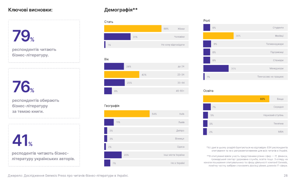 Більшість авдиторії бізнес-літератури — молоді містяни з високим рівнем освіти: 68% — жінки, 31% — чоловіки. Найбільша вікова група — 25–34 роки (42%), далі 35–44 роки (25%) і молодь до 24 років (24%). Лише 9% читачів старші за 45 років.