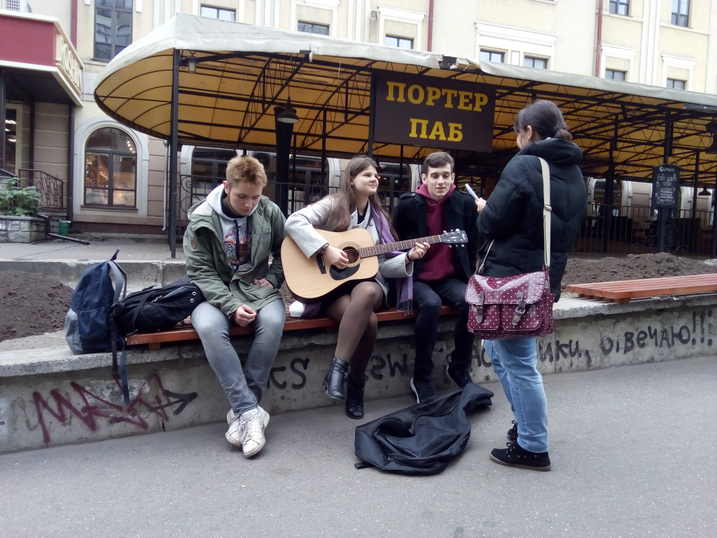Знайомтесь – київські студенти Влад, Анжеліка та Данило; їм лише виповнилось по 17 років. Саме сьогодні вони вперше вирішили спробувати себе в ролі вуличних музикантів. Батьки щодо такого хобі не заперечують. Наразі студенти-музиканти навчаються у Національному університеті кібернетики та комп`ютерних наук. Усі вміють грати на гітарі, Данило ще освоїв гру на саксофоні. Анжеліка на вторговані гроші планує відсвяткувати Геловін зі студентами свого університету, і головне – купити багато цукерок, тому компанія вмостилась перед одним з магазинів «Рошен». Через це музиканти дуже хвилюються – чи не зайняли вони чиєсь місце на площі й чи не буде проблем з поліцією. На прощання ми вирішили запитати у них, що для них є щастя.