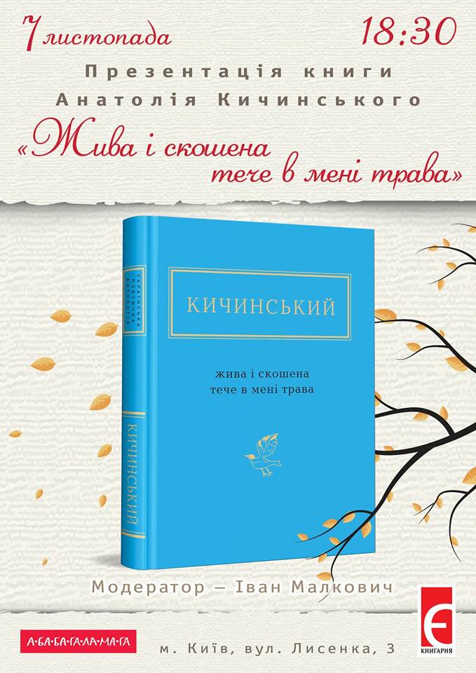 Видавництво «А-БА-БА-ГА-ЛА-МА-ГА» і «Книгарня «Є» запрошують вас на презентацію нової збірки поетичної серії «УПА» (Українська Поетична Антологія) — «Жива і скошена тече в мені трава» Анатолія Кичинського, яка відбудеться за участі автора 7 листопада о 18:30 у «Книгарні «Є» (м. Київ, вул. Лисенка, 3). Модератор — Іван Малкович.
