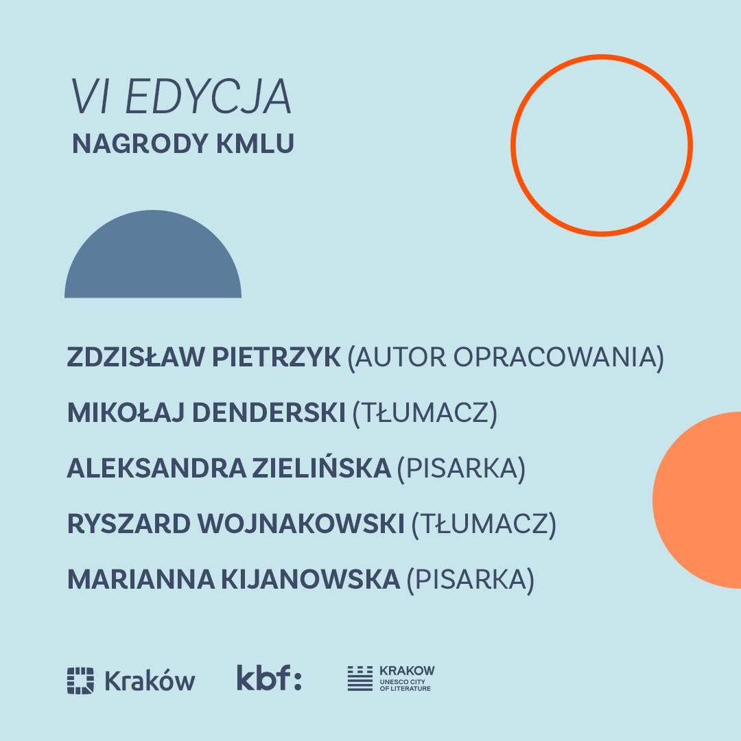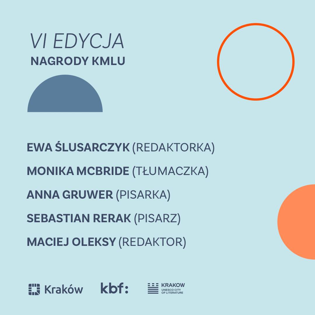 Серед інших лауреатів VI премії KMLU — Мілош Бєждзіцький (Ha!art), Ола Билиця (Kropka), Марцін Чарнік (Filtry), Анджей Дибчак (Nisza), Якуб Ґутковський (Fundacja KONTENT), Олександра Кшановська-Вжеціон (Powergraph), Зофія Лорек (Drzazgi), Олександра Малєцька (Ha!art), Войцех Марец (LOKATOR), Моніка Макбрайд (Stowarzyszenie Żywych Poetów), Янiна Наськальська-Бабік (Austeria), Анна Новицька (Kropka), Мачей Олєкси (Karakter), Олександра Падух-Батко (Czarne), Лешек Пауль (Harmolipi), Здзіслав Пєтржик (Księgarnia Akademicka), Себастіан Рерак (Katalog Press), Ева Слюсарчик (Karakter), Ришард Войнаковський (wydawnictwo j), Ізабела Зайонч (Książkowe Klimaty), Ельжбета Зехентер-Сплавінська (Stowarzyszenie Pisarzy Polskich – Oddział Kraków), Олександра Зєлінська (Agora) та Радек Рак (Powergraph).