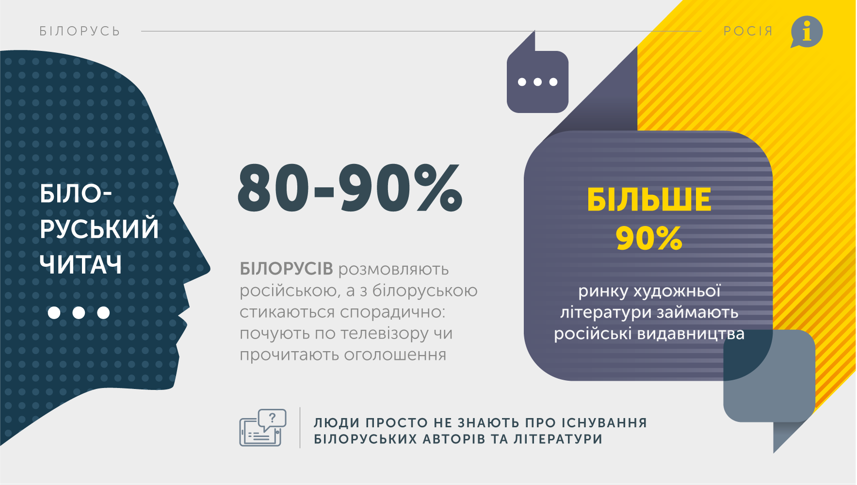 Ситуація в Україні сьогодні – це приклад для білоруського книжкового ринку. У Білорусі гостро стоїть питання білінгвізму: 80-90% розмовляють російською, а з білоруською стикаються спорадично: почують по телевізору чи прочитають оголошення. Більше 90% ринку художньої літератури займають російські видавництва. Це ускладнює діяльність білоруських незалежних видавництв й заважає розвитку не лише культури держави, а й приватності літератури. Як показують дослідження, близько 50% читають художню літературу з різною періодичністю, на жаль, білоруську літературу читають близько 12% з тою чи іншою регулярністю.