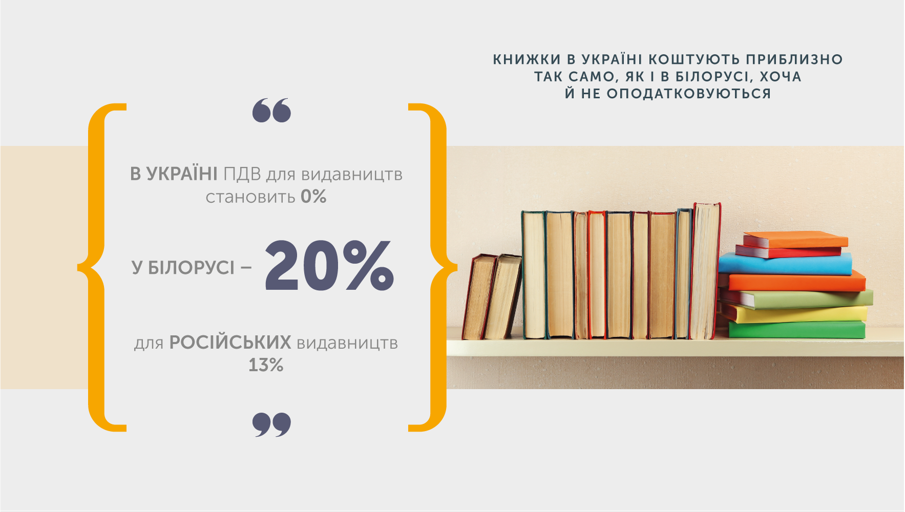 Книжки в Україні коштують приблизно так само, як і в Білорусі, хоча й не оподатковуються. А зекономлені видавництвом гроші можна направляти на інші керунки діяльності: маркетинг, просування, додатковий персонал і так далі. Білорусь таких можливостей немає.