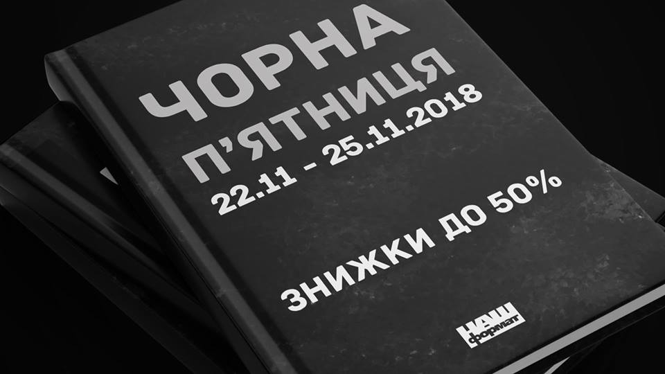Чорна п’ятниця у «Нашому форматі» діятиме з 22 по 25 листопада в інтернет-магазині та книгарні на вулиці Алли Горської, 5. Знижки до 50 % на книжки видавництва, а також до 40 % на книжки інших видавництв.