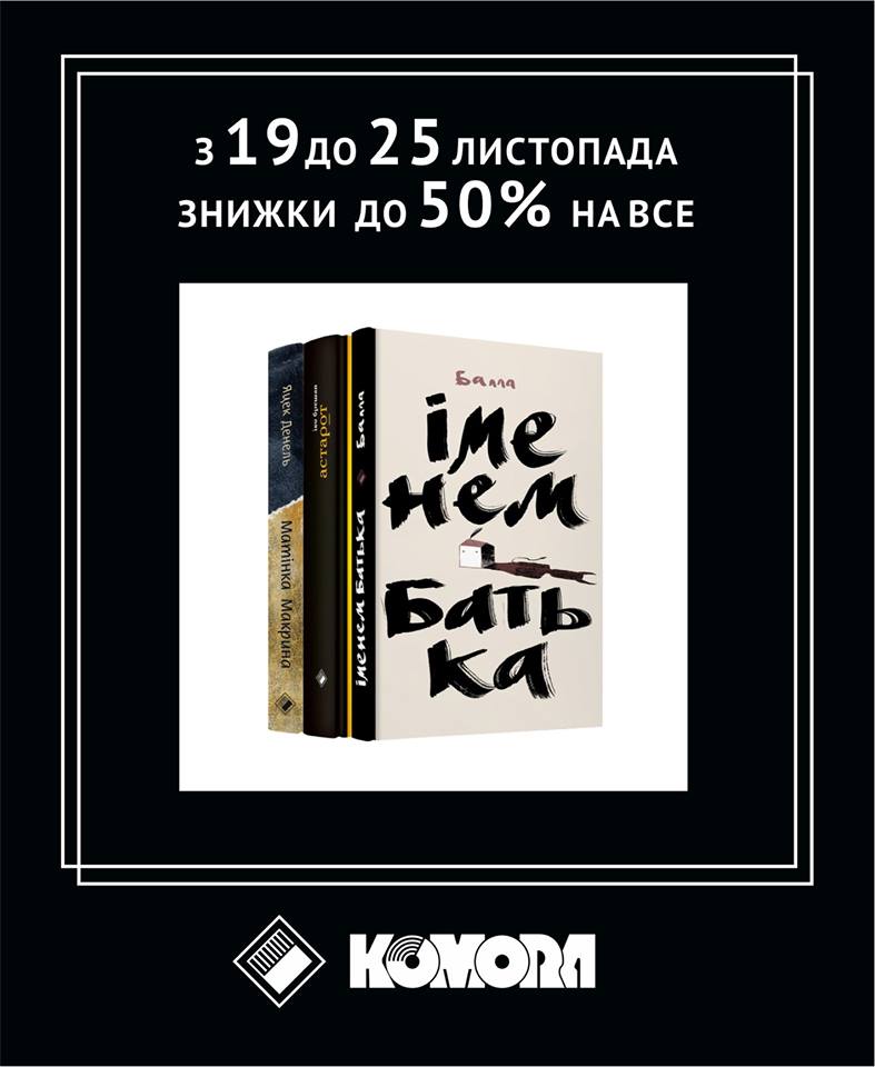 У «Коморі» знижки увесь тиждень, не лише на чорну п’ятницю. До 50% на все на сайті komorabooks.com та в офісі видавництва в Києві. Замовляйте онлайн або приходьте у будні з 11.00 до 18.00 за адресою: метро Лівобережна, вул. Є. Сверстюка, 19, оф. 1102.