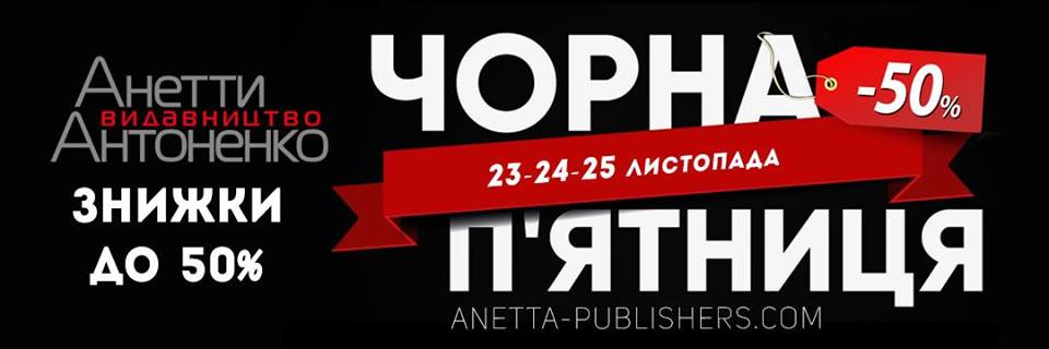 «Видавництво Анетти Антоненко» запрошує на Чорну п’ятницю 23-25 листопада. Упродовж Акції надається знижка на ВСІ паперові книжки видавництва, які наявні на складі: 30% – видання 2018 року, 50% – видання 2017-2014 років.