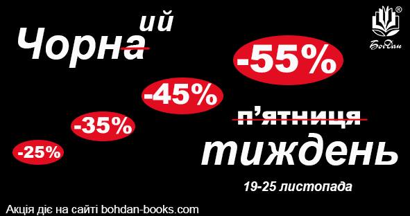Із 19 по 25 листопада у «НК – Богдан» буде цілий Чорний тиждень. Сотні книжок зі знижкою до 55% у спецрубриці Чорний тиждень на сайті видавництва.