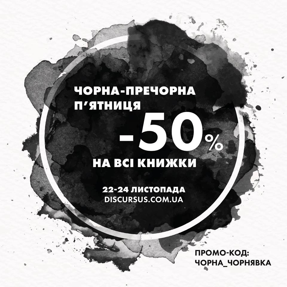 Чорна п’ятниця у Discursus триватиме протягом 22-24 листопада. Всі книжки видавництва можна буде придбати зі знижкою -50%. Для цього потрібно: зайти на сайт видавництва, обрати книжки та при завершені оформлення замовлення у відповідному полі вказати промо-код: ЧОРНА_ЧОРНЯВКА.