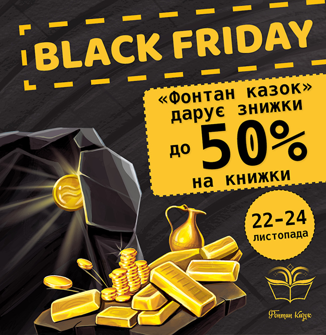 У період з 22 до 24 листопада «Фонтан казок» влаштовує «Чорну п’ятницю» – можна буде придбати книжки зі знижками до 50%. Перелік акційних видань з’явиться на сторінці акції на сайті у розділі «Акції» 22 листопада о 00:01. Акція триватиме до 23:59 24 листопада.
