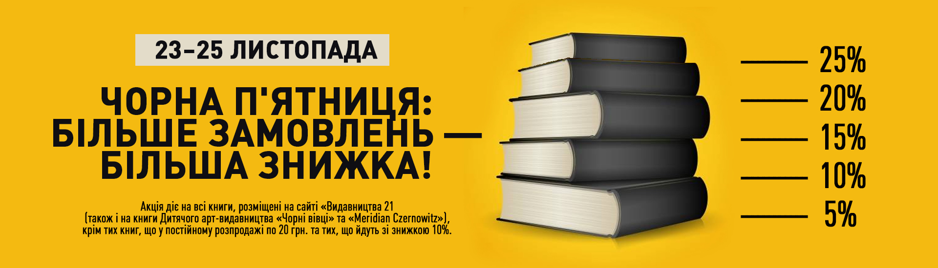 Чорна п’ятниця «Видавництва 21» триватиме з 23 по 25 листопада на їхньому сайті. Знижки: від 5% до 25%. Вони надаватимуться в залежності від ціни на книжку ‒ від найдешевшої до найдорожчої (більша ціна на книжку ‒ більша знижка):