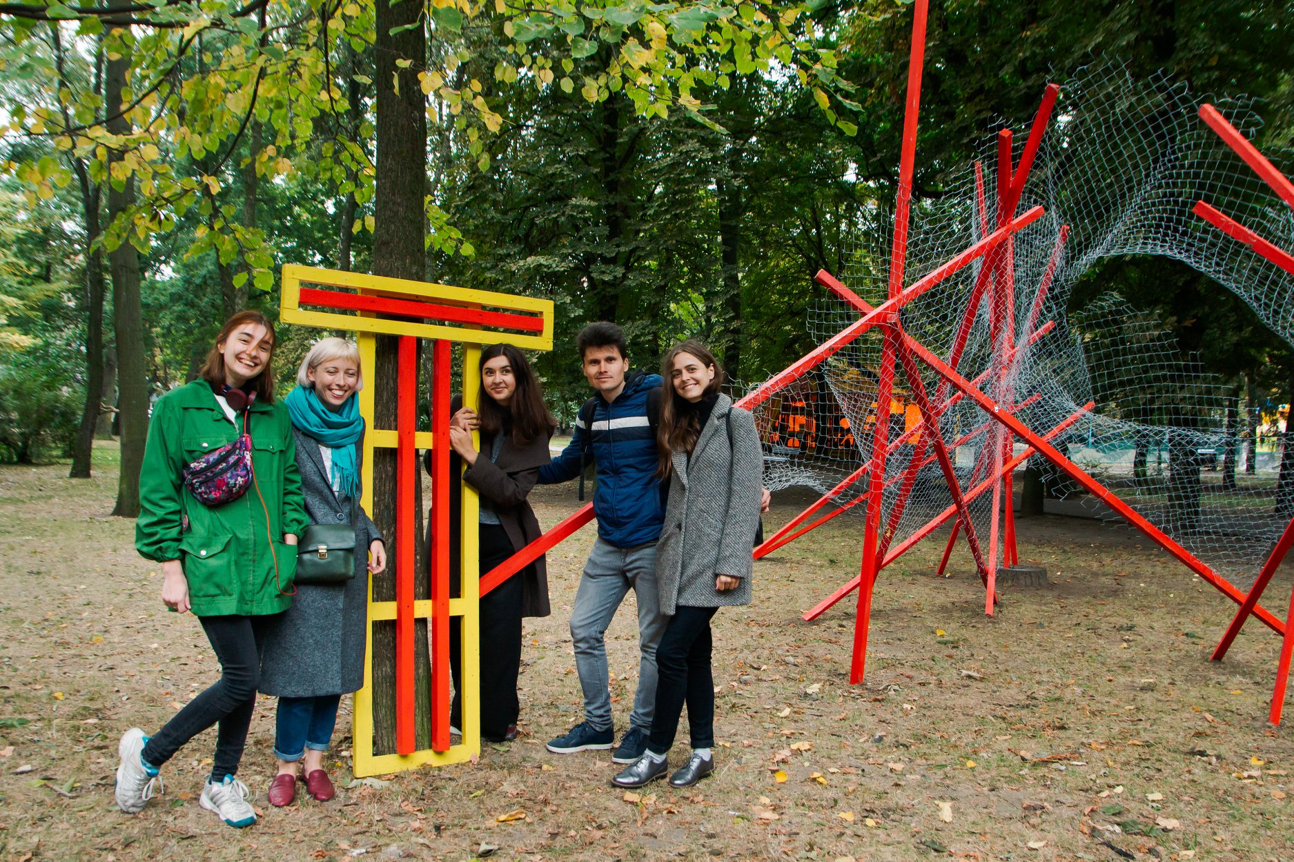 Організаторки фестивалю з митцем Антоном Логовим та інсталяцією «Т» під час відкриття інсталяцій.