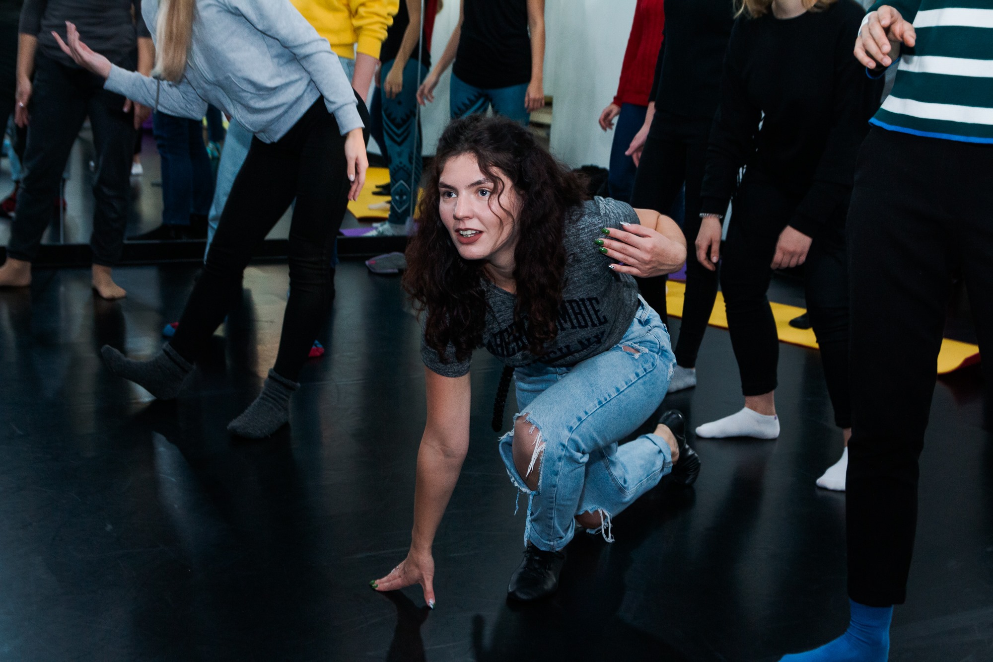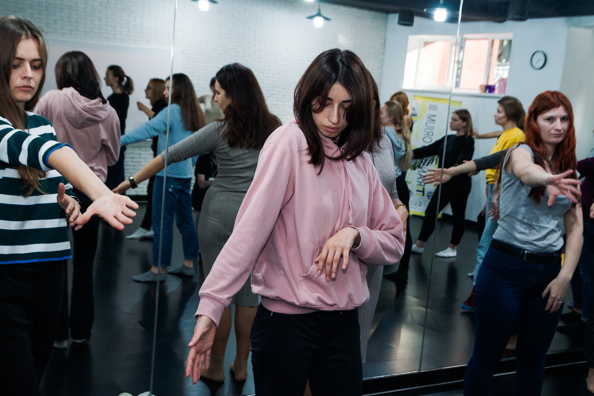 Насичений подіями Освітньої програми перший день TRANSLATORIUM продовжився тригодинним воркшопом «Dancing through translation: researching possibilities for intercultural communication through language, translation and human bodies in motion» ( «Танець крізь переклад: дослідження можливостей міжкультурної комунікації через мову, переклад, людське тіло в русі») від Антона Овчіннікова й Пітера Кайла. Воркшоп проходив у школі балету, і кілька перекладачок зізналися, що не реєструвалися на нього, бо «з танцями ніяк». Але дарма, адже це були геть незвичайні танці.