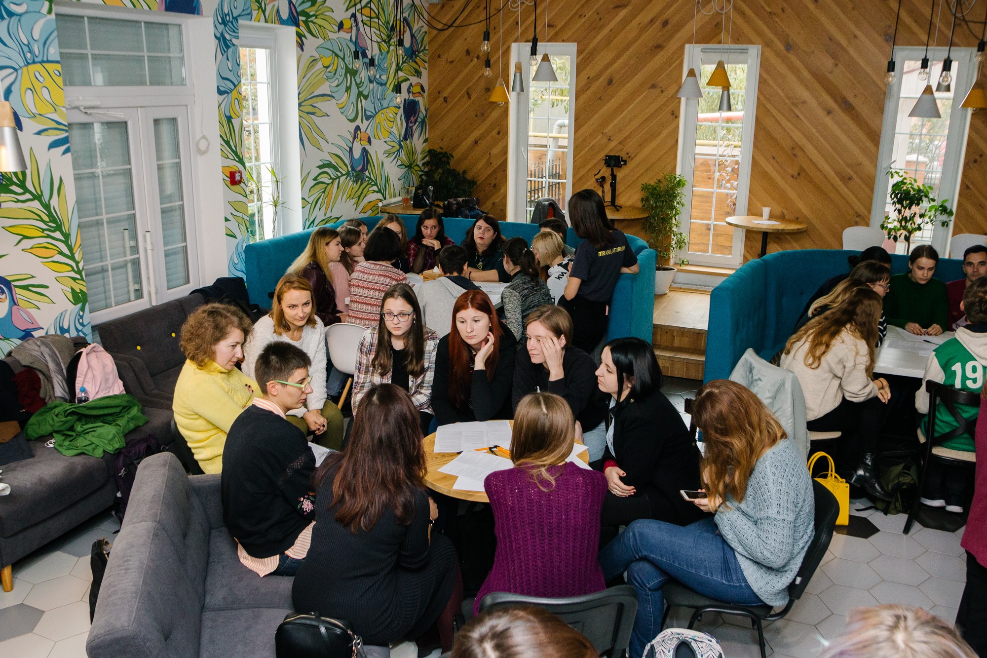 Після відкриття з кав’ярні «Feelin’good Coffee» відвідувачі переходять на іншу локацію – у мовну школу «ОЛА». Там говорять на складну й важливу тему з Ольгою Любарською — про гігієну праці в інтелектуальному фрілансерстві. Перекладачка поділилася власним досвідом професійного вигорання й порадила всім його уникати: «Коли «неділю віддаєш Богу, десятину — церкві», то п’ятину — віддаєш психотерапевту. Навіть якщо працювати за затвердженим Кабміном мінімумом, 150 гривень за сторінку (1800 знаків з пробілами). Відновлення коштує дуже дорого, тому треба не вигорати».