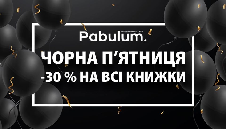 Чорна п’ятниця у «Pabulum» триватиме три дні — з 29 листопада до 1 грудня. Знижки 30 % діятимуть на всі книжки в інтернет-книгарні видавництва. Доставка усіх замовлених книжок здійснюватиметься Новою Поштою в понеділок, 2 грудня.