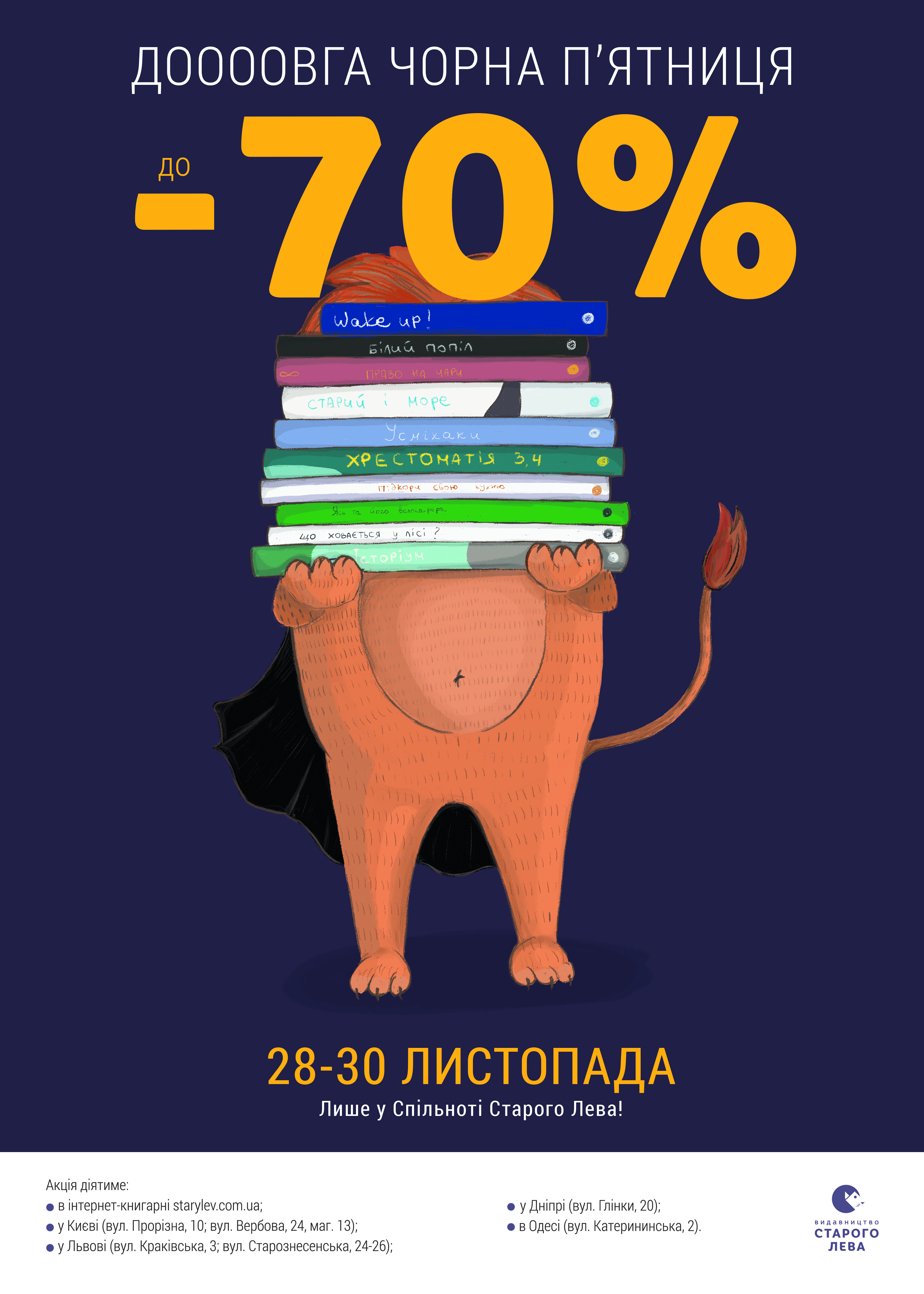Чорна п’ятниця триватиме три дні – з 28 до 30 листопада – у всіх книгарнях Старого Лева та в онлайн-магазині. На вас читачів чекатимуть знижки до 70% на близько 200 книжок (не тільки на паперові, а й на електронні). Серед акційних пропозицій є й художня література і нон-фікшн; історії для дітей, дорослих і родинного читання; книжки, що змусять плакати, сміятися, надихатимуть до нових звершень та рухатимуть вперед, зрештою, не залишать байдужим нікого.