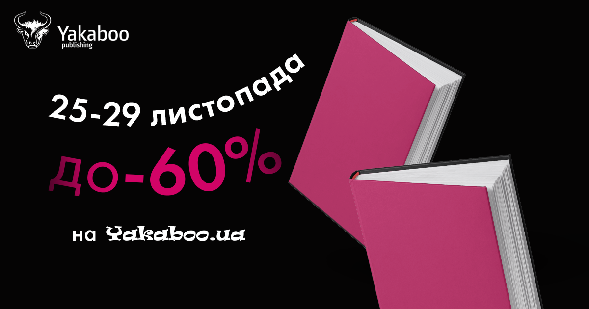 Видавництво Yakaboo Publishing пропонує знижки від 25 до 60 % на друковані книжки, 30% – на електронні. Видання зі знижками можна буде придбати у книгарні Yakaboo з 25 до 29 листопада.