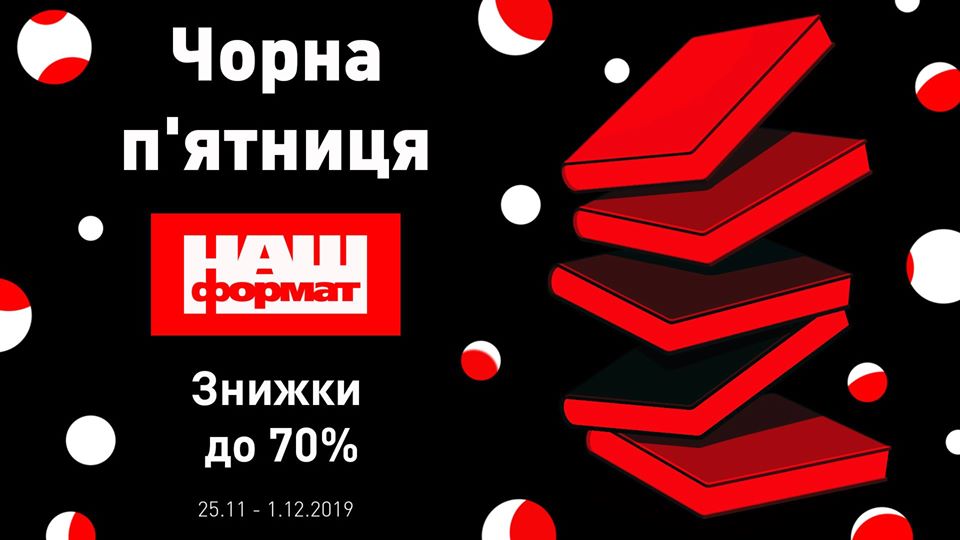 У «Нашому Форматі» Чорна п’ятниця триватиме з 25 листопада до 1 грудня в інтернет-магазині (замовлення можна робити цілодобово) та в книгарні (м. Київ, пров. А. Горської, 5). Видавництво готує знижки до 70% на свої книжки та понад 2000 назв від українських видавництв, а також подарункові комплекти зі знижкою та особливі сюрпризи.