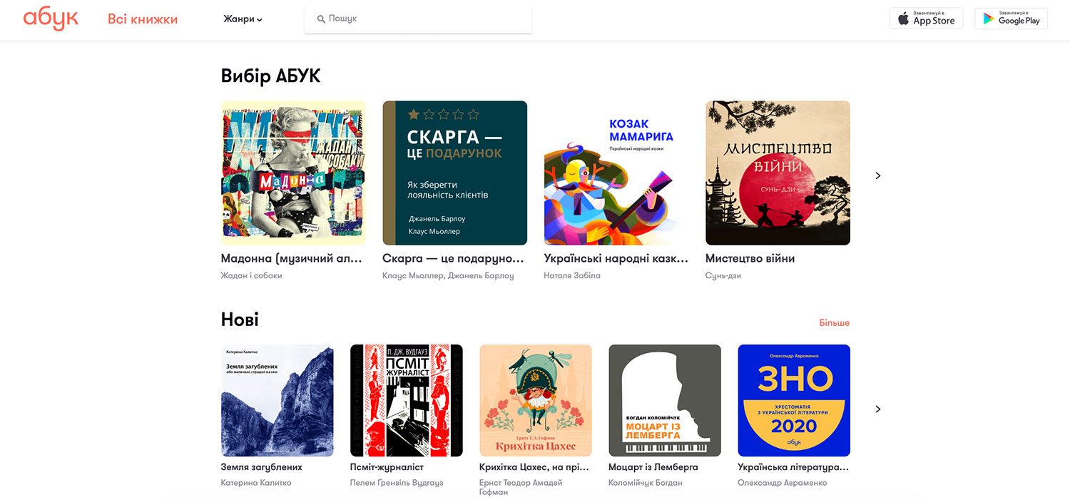 АБУК — це перша українська аудіокнигарня для мобільних пристроїв і видавництво україномовних аудіокнижок. У додатку АБУК для Android та iOS можна слухати книжки онлайн та офлайн, використовуючи закладки, прискорювач, таймер сну та інші зручні функції. Твори розподілені за жанрами та добірками, є шкільна класика й найсучасніша українська література, нонфікшн і дитячі казки, детективи й філософські трактати.