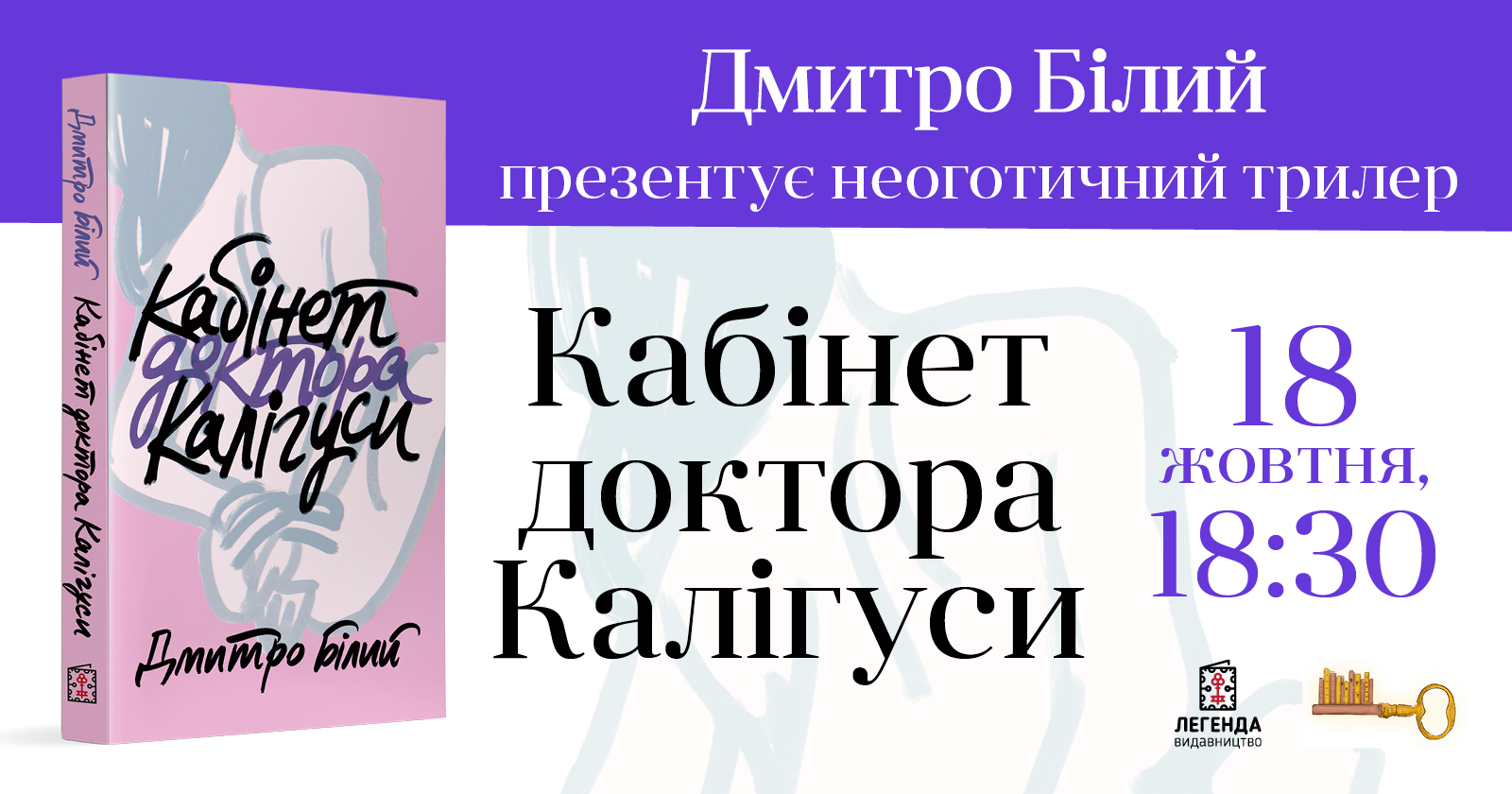 Видавництво «Легенда» і Львівська обласна бібліотека для юнацтва ім.Р.Іваничука (пл. Ринок, 9) запрошують на презентацію неоготичного трилера Дмитра Білого «Кабінет доктора Калігуси» у четвер, 18 жовтня о 18:30. Модераторка – директорка бібліотеки Тетяна Пилипець.