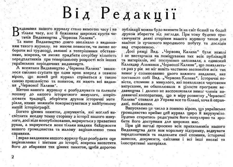 У передовій статті редакція часопису зазначила, що друкуватиме історичні розвідки, мемуари, оповідання, документи та фотографії, які висвітлюють період визвольних змагань, а тому вкотре зверталася з проханням до співпраці. Уже пройшло трохи часу після втрати державності, емоційність у спогадах поступово поступалася аналітиці, глибшому переосмисленні національно-визвольних процесів. Загалом за весь період на сторінках часопису опублікували близько тисячі різноманітних текстових матеріалів, більше півтораста фотографій та репродукцій.