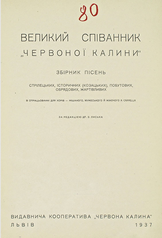 До речі, пісенні надбання були дуже популярними у той час. Зокрема, «Великий Співанник „Червоної Калини“» 1937 року став чи не найкращим нотним виданням. Його наклад сягнув 3 тисяч примірників. Упорядником і редактором був Зіновій Лисько, композитор, музикознавець, доброволець Легіону Українських Січових Стрільців. Це збірник обробок стрілецьких і історичних (козацьких), побутових, обрядових, жартівливих народних пісень для мішаного, чоловічого і жіночого хорів. Загалом 229 творів 14 українських композиторів (Василя Барвінського, Михайла Гайворонського, Миколи Колесси, Бориса Кудрика, Зиновій Лиська, Станіслава Людкевича, Нестора Нижанківського, Антіна Рудницького, Романа Сімовича, Миколи Лисенка, Миколи Леонтовича, Кирила Стеценка, Пилипа Козицького, Михайла Вериківського. Цікавим і промовистим фактом є заборона польською цензурою друку пісні Романа Купчинського «Ой, та й зажурились стрільці січовії».