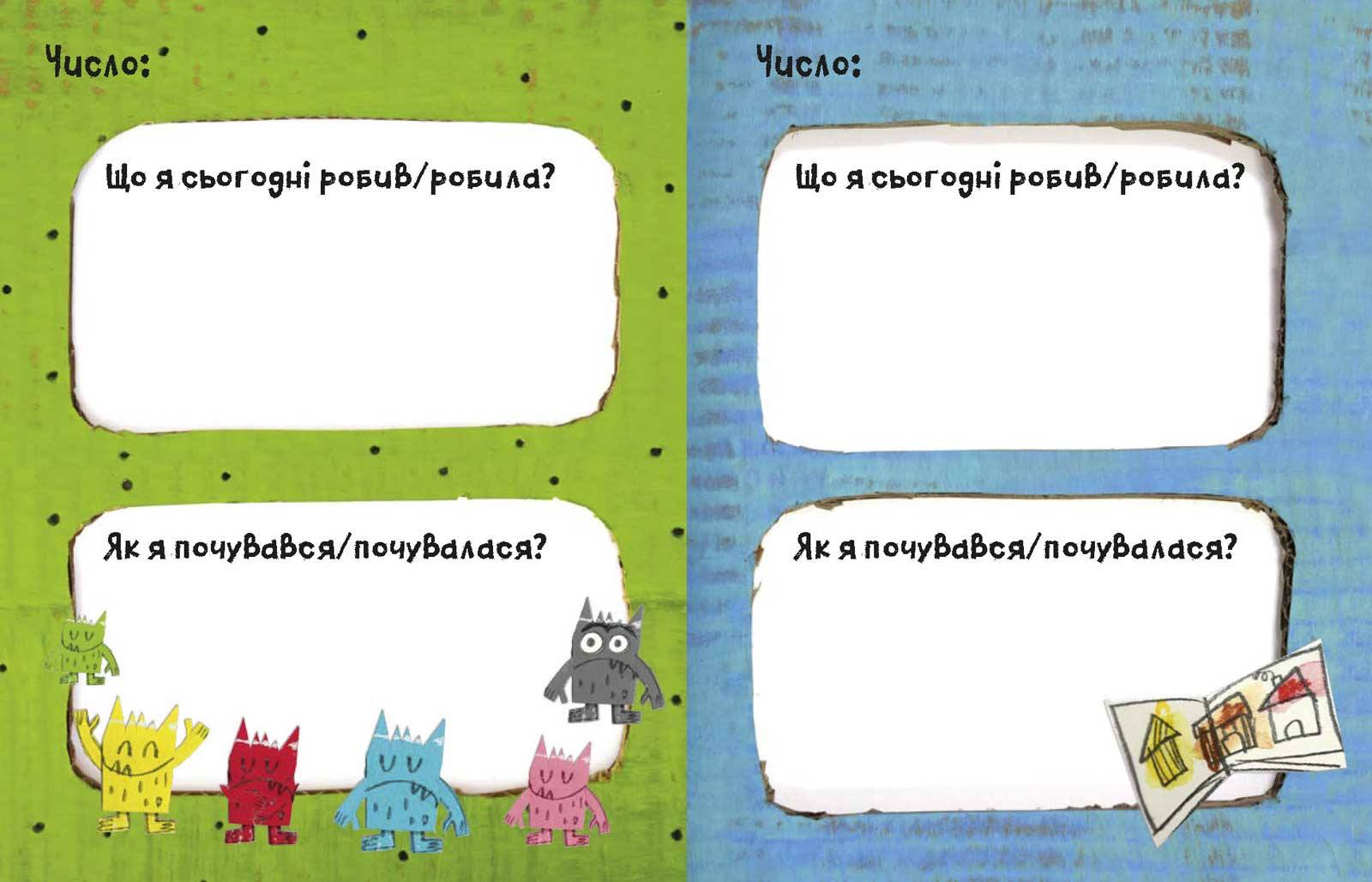 Робити це можна в будь-який спосіб — хоч словами, хоч малюнками. З одного боку, такі щоденні вправи допоможуть пригадати й усвідомити свої почуття, з іншого — сформувати причинно-наслідкові зв’язки, проаналізувати свою поведінку, зрозуміти, які вчинки викликали позитивні емоції, які — негативні. Також у щоденнику є вправи для творчості, де пропонується описати або намалювати улюблену тваринку, омріяний подарунок на Різдво, список планів на вихідні, карнавальний костюм, зобразити свого Монстрика чи подякувати вчительці / вчителю та підсумувати речі, які вони дізнались у школі за рік.