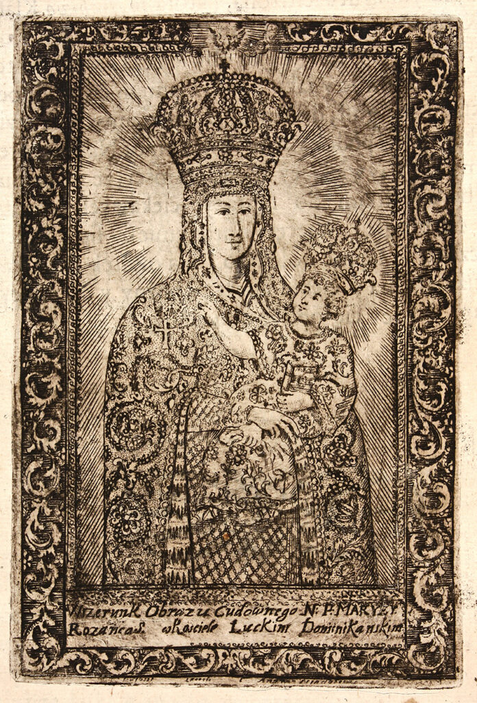 Ікона Луцької Богородиці, гравюра з підписом «Wizerunek Obrazu Cudownego N. P. Maryy Rozanca S. w Kosciele Łuckim Dominikanskim»