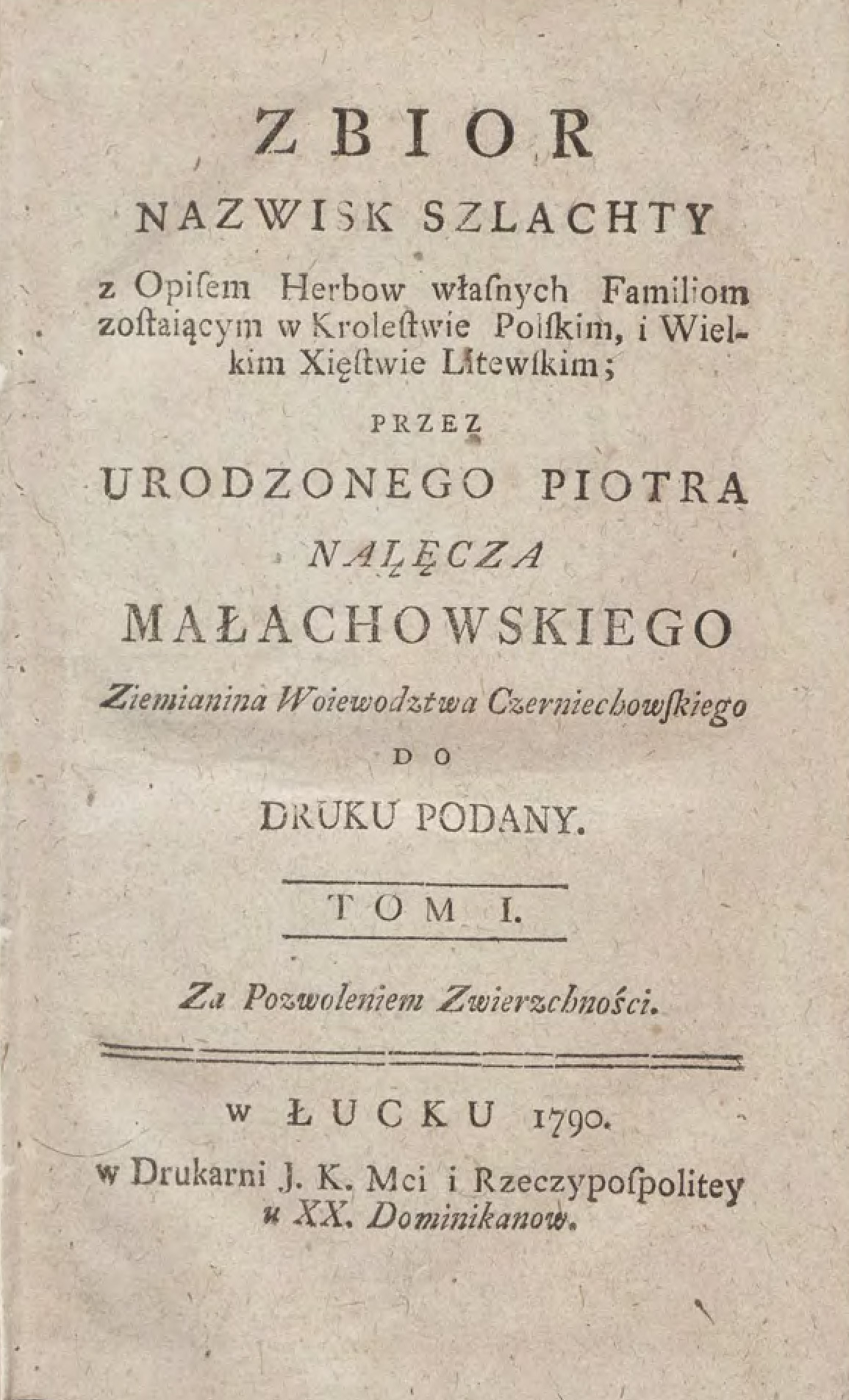Серед луцьких видань світського характеру, напевно, найпопулярніші видання – геральдична праця Петра Малаховського герба Налєнч (бл. 1730–1799) «Zbiór nazwisk szlachty z opisem herbow własnych Familiom zostaiącym w Królestwie Polskim, i Wielkim Xięstwie Litewskim» (1790). За бібліографічними джерелами у цьому ж році у Луцьку побачив світ і «Dodatek szlachetnych familii na Seymie Warszawskim 1790 Indygenaty i Nobilitacye otrzymanch…» обсягом у 16 сторінок, укладений тим самим автором. Названі видання вміщують перелік шляхетських прізвищ Польського королівства та Великого князівства Литовського з описом родових гербів. Вдруге працю Малаховського опублікували 1804 року в Любліні в друкарні отців тринітаріїв, виправивши помилки луцького видання.