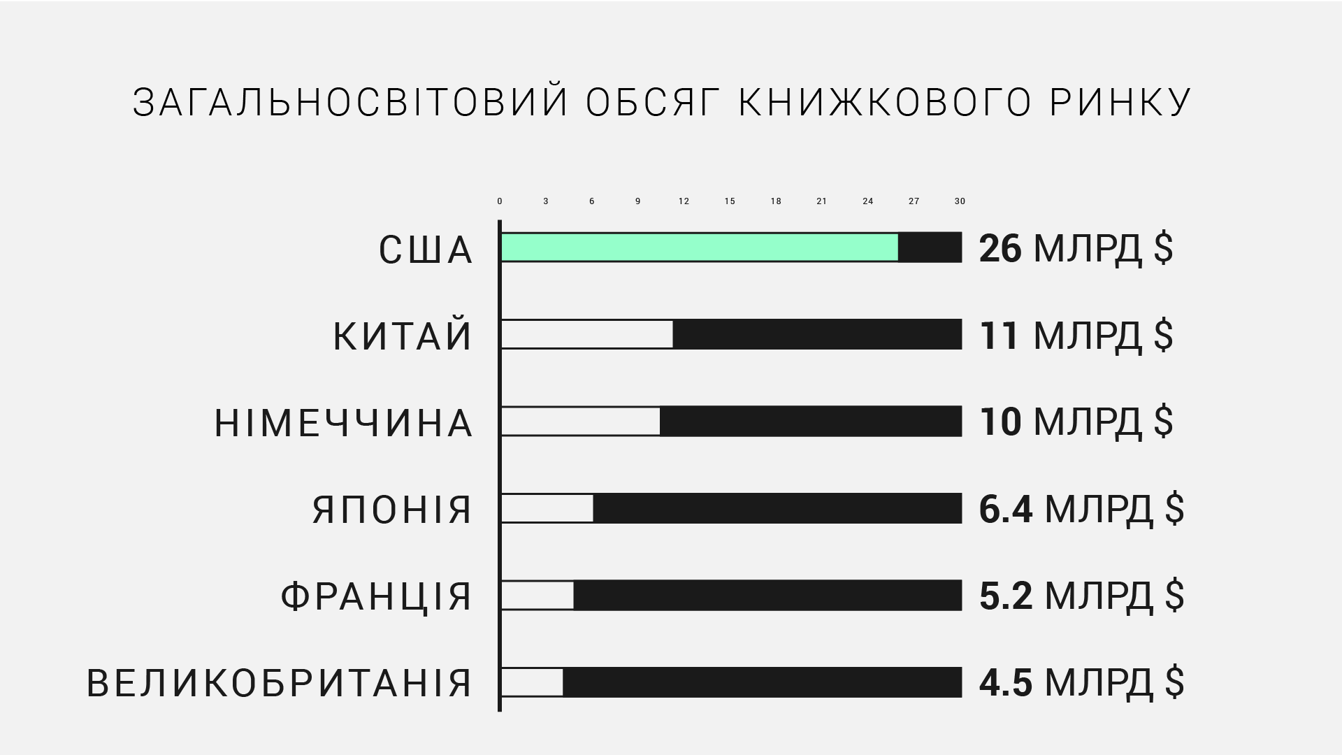 Але для видавців цікавішими є показники загального обсягу, тобто продажі. Загальносвітовий обсяг книжкового ринку — 100-120 мільярдів доларів. Лідерами є США (26 мільярдів доларів), Китай (11 мільярдів доларів), Німеччина (10 мільярдів доларів), Японія (6,4 мільярда доларів), Франція (5,2 мільярда доларів) та Великобританія (4,5 мільярди доларів). Поляки у 2018 році продали книжок на суму 1,2-1,3 мільярда доларів, у Росії цей показник — у межах 1,5 мільярдів доларів. За даними Інституту книги, український ринок оцінюється від 88 до 110 мільйонів доларів.