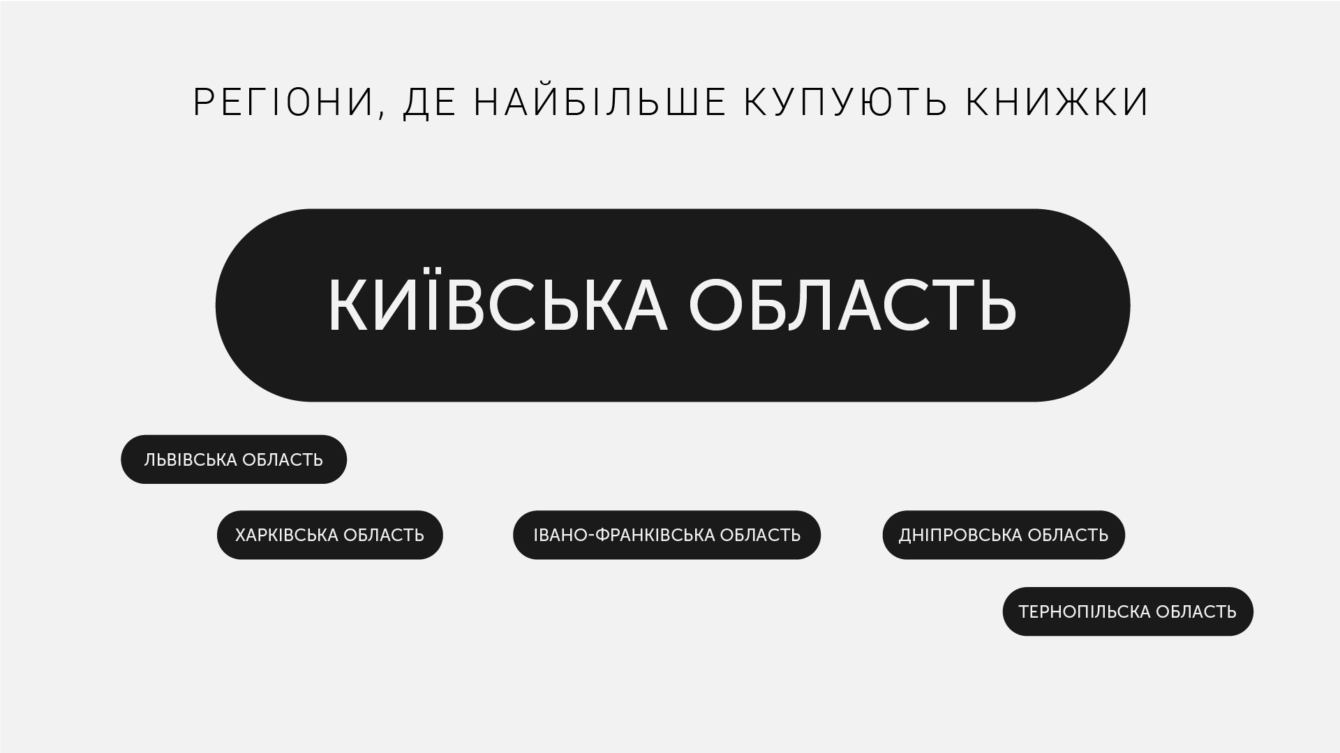 У контексті продажів також варто згадати регіони, де найбільше купують книжки. За даними Дмитра Вахніна, лідером є Київська область, на яку припадає третина усіх продажів. Наступну третину визначає п’ять областей — Львівська, Харківська область, Івано-Франківська, Дніпропетровська та Тернопільска. Решта областей розподіляють залишок від загальних обсягів.