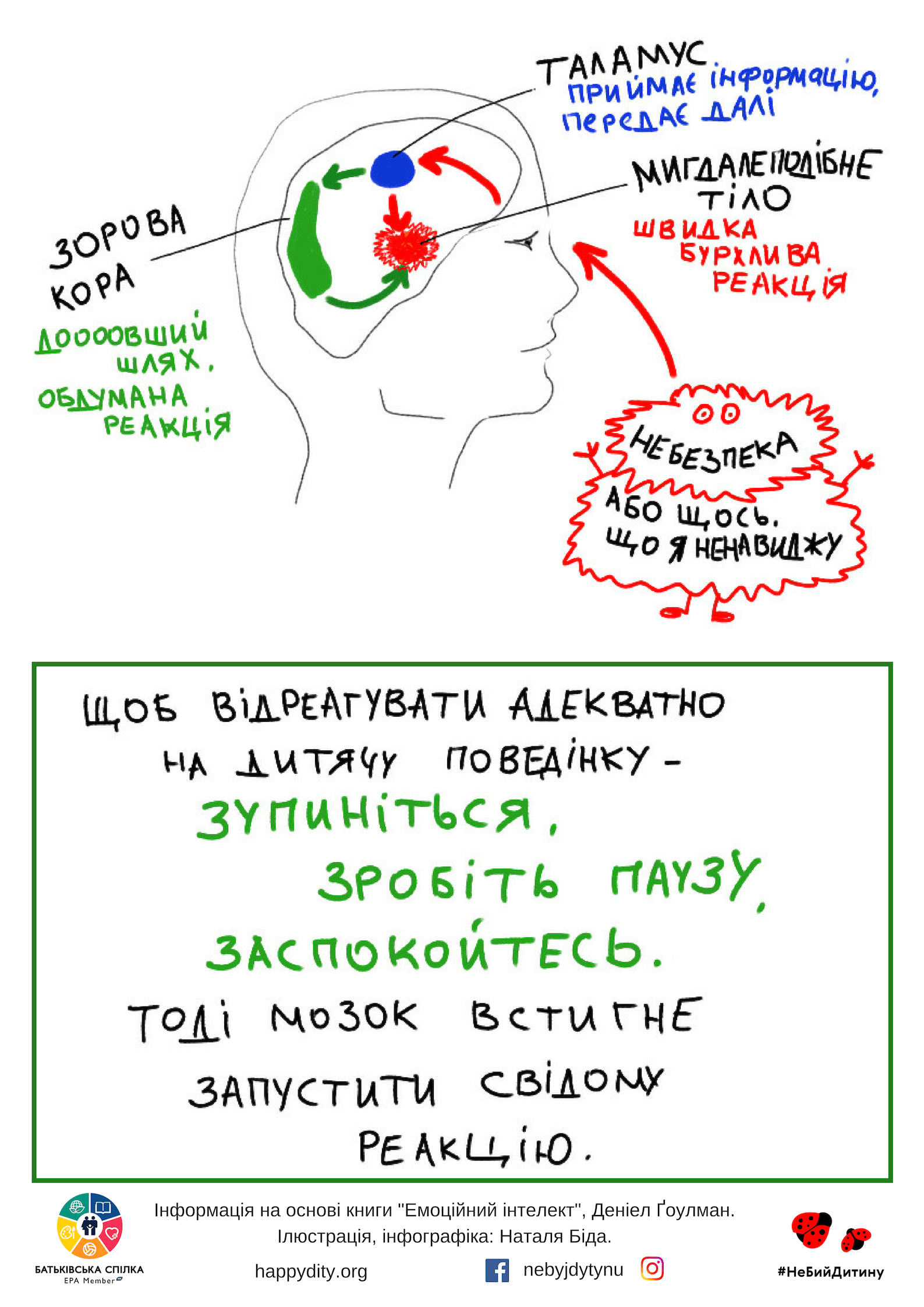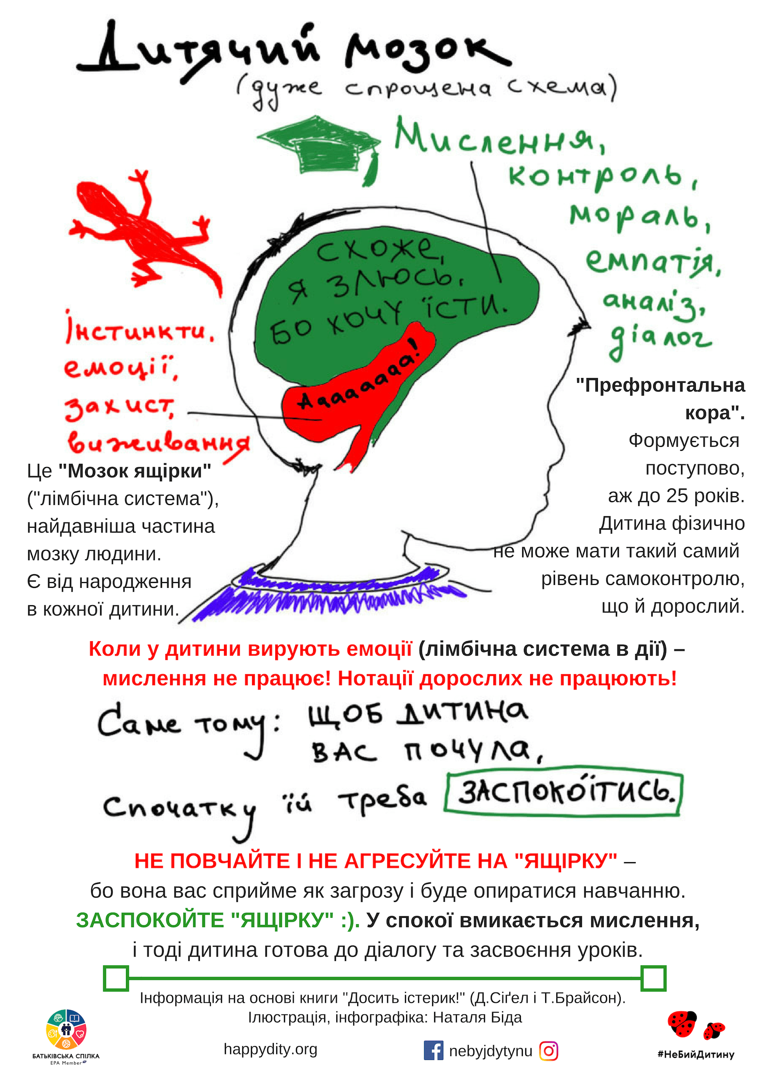 Коли в дитини вирують емоції – мислення не працює, тому нотації від дорослих у цей момент не є ефективні, а тільки ще більше розбурхують найдавнішу емоційну частину мозку дитини – «мозок ящірки»/«лімбічна система», яка будь-який напад чи домінацію сприймає як загрозу.