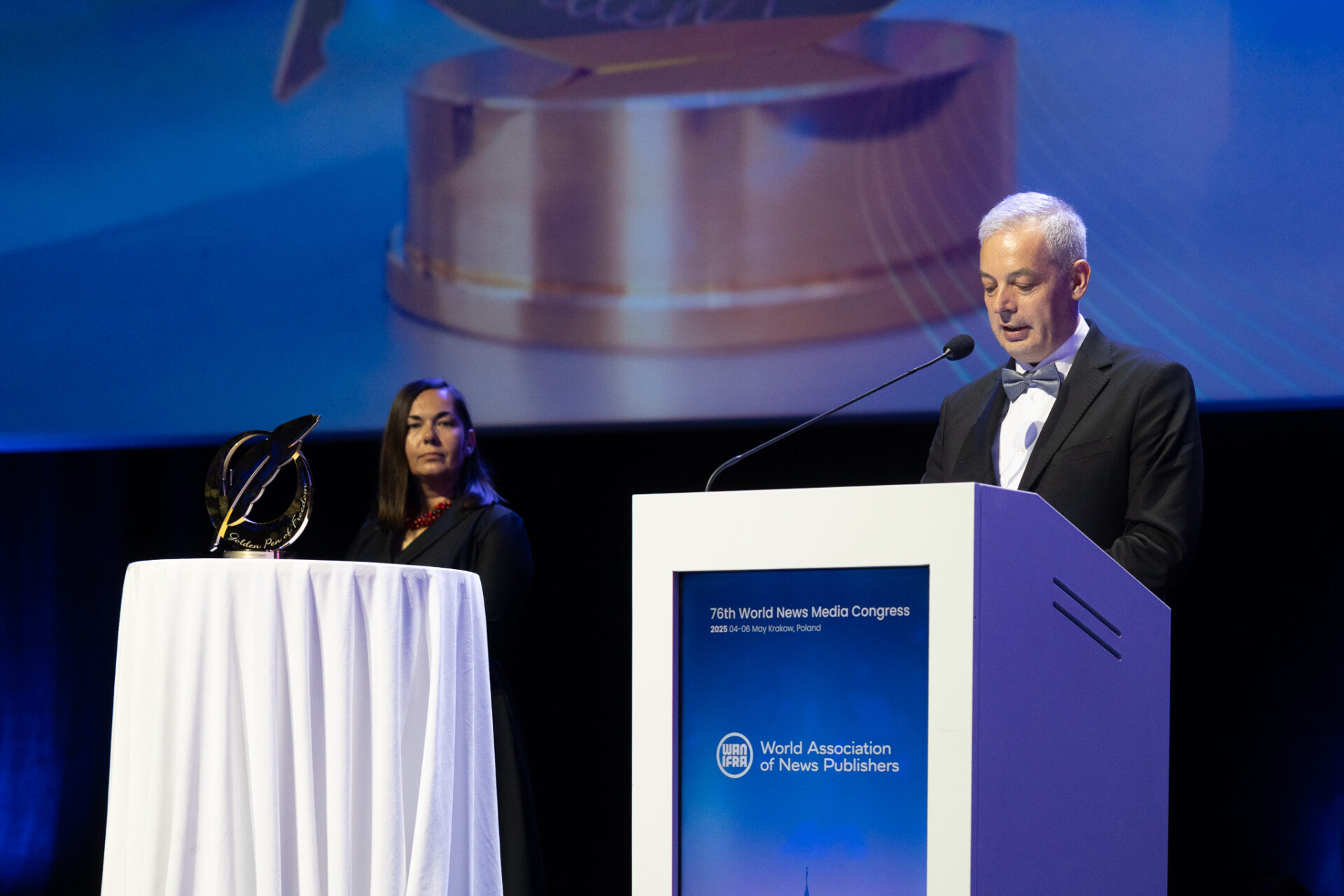 The award was accepted by Oksana Brovko, CEO of the Association of Regional Press Publishers of Ukraine, and Oleksiy Pogorelov, President of the Ukrainian Media Business Association, on behalf of all Ukrainian media professionals.