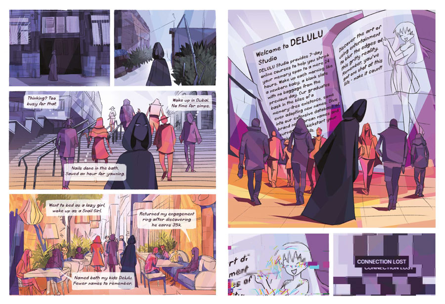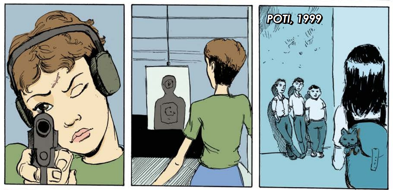 The comic rapidly moves between past and present like sequences in a film, offering brief glimpses instead of in-depth narratives. Eventually, the attentive reader can piece together and complete the story.