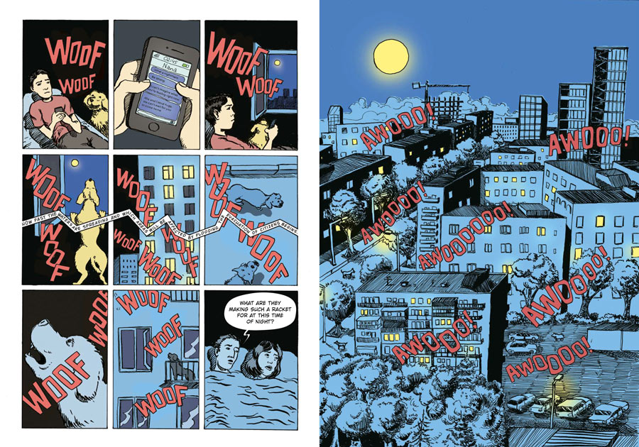 The drawings are somewhat rough, conveying the tension and helplessness people feel when they’re losing the solid ground beneath them. Warm pastel tones contrast with fragments in cold tones – a contrast that is crucial to understanding the narrative. This becomes especially clear in an everyday but tense moment: As Irma develops photographs in a darkroom, a red light seems to bathe everything with blood. Phrases from the news about the explosion of a hydroelectric power plant can be heard from the next room – a room lit only by a TV screen.