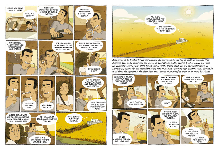 In Dnipro, Vira is greeted by Olya, her colleague journalist, who works on the front lines and has arranged for a driver to take her to Pokrovsk. The accompanying illustration’s warm hues slightly soften the tension, and for a short moment, the two colleagues share casual conversations mixed with jokes about the costly seafood that remains unsold since the beginning of the invasion.