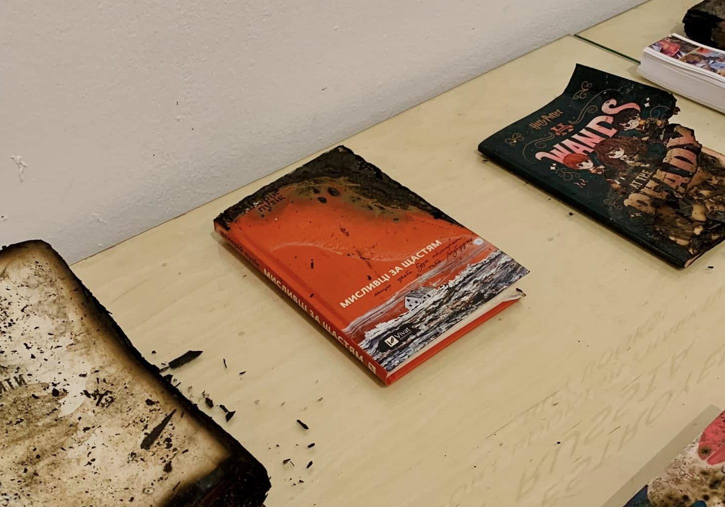 A copy of “Hunters of Happiness” by Valeriy Puzik that survived the Russian strike on the Factor Druk printing house. The book’s first print run was destroyed in May 2024. Photo: Ukrainian Book Institute
