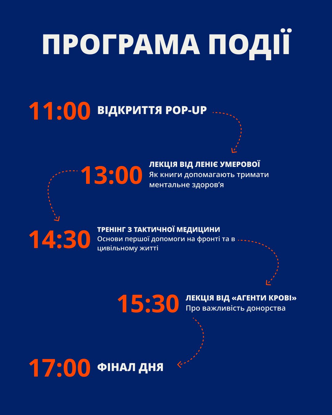 Упродовж дня відвідувачі зможуть взяти участь у майстер-класі з тактичної медицини, почути практичні поради щодо першої допомоги як на фронті, так і в цивільному житті, а також відвідати лекцію про ментальне здоров’я, де говоритимуть про медитацію, усвідомленість і техніки збереження внутрішнього фокусу в часи війни. Відбудеться і зустріч з ініціативою «Агенти крові», яка розповість про важливість донорства.