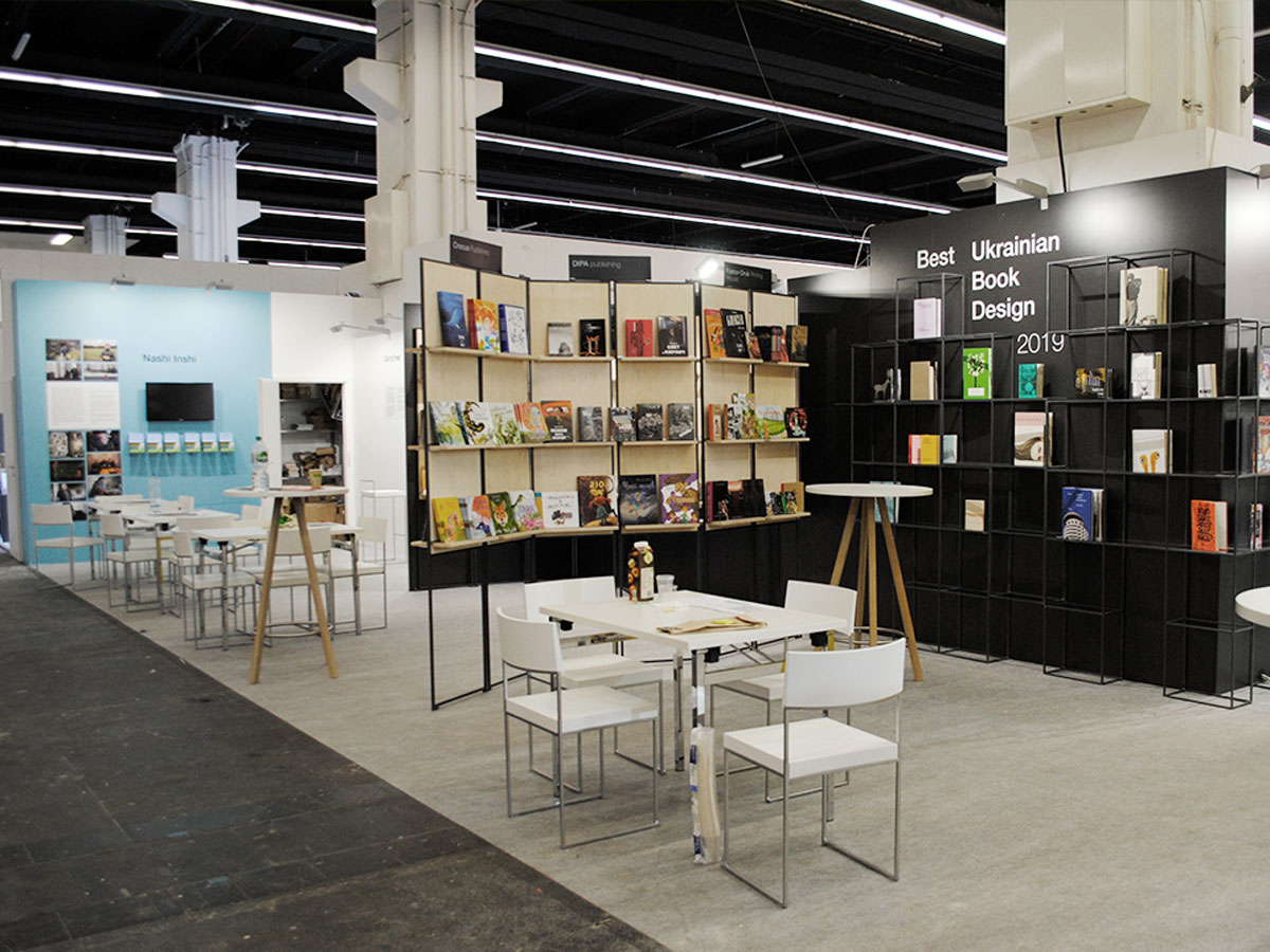 Візуальне оформлення національного стенда розробив медіахудожник Андрій Лінік, який працював над дизайном торік, і це помітно. Своєю просторовою композицією стенд дуже схожий на попередній, можна навіть сказати, що він — «апдейт» стенда торішнього. На зміну стриманим білим і синім кольорам 2018-го, прийшло яскраве поєднання графітового, сірого та блакитного, розташування полиць зазнало певних змін, зона переговорів ущільнилася й отримала більшу пропускну здатність. Але загалом все залишилося на вже знайомих місцях, тож ті відвідувачі, які бачили Україну у Франкфурті 2018-го, не мали жодних проблем з орієнтуванням на оновленому стенді.