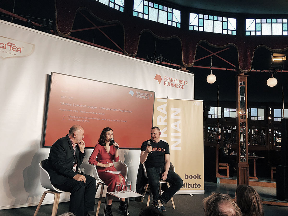 Ще одна подія за участі Сенцова — дискусія під назвою «Україна: 5 років боротьби» — проходила в окремій локації ярмарку — Lesezelt. Майданчик виявився трохи дивним місцем як для розмови про російські тюрми, голодування та психологічний тиск, оскільки Lesezelt нагадує циркову арену, по внутрішньому периметру якої розташовані столи для чаювання. Але навряд чи організатори події з українського боку мали змогу це передбачити наперед, тож це більше схоже на недопрацювання німецької сторони.