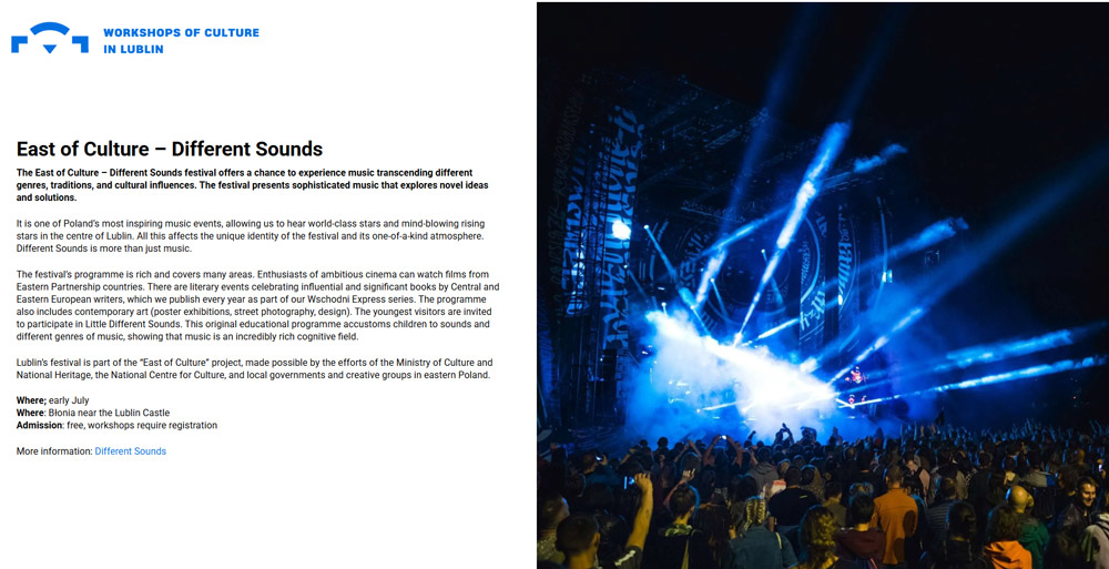 Із 2014 року муніципальна культурна установа Workshops of Culture організовує щорічний фестиваль East of Culture – Different Sounds – масштабну подію, яка представляє сучасних митців у міжнародному контексті. Від самого початку фестиваль супроводжувався літературною програмою, що знайомила з новими виданнями з сусідніх країн Польщі, зокрема України та Білорусі. Згодом до програми додалися переклади з литовської, латиської, естонської та угорської мов.
