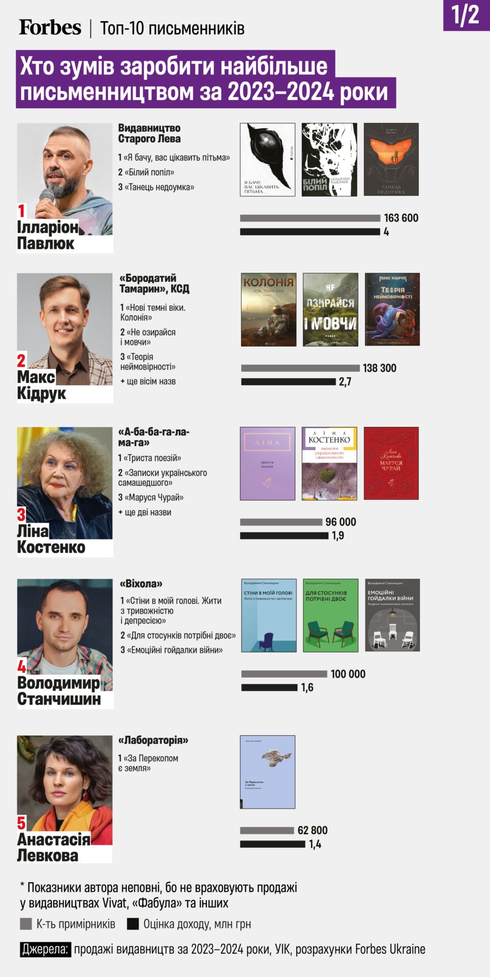 - Ілларіон Павлюк, автор «Я бачу, вас цікавить пітьма», «Білий попіл» і «Танець недоумка». Продаж близько 164 тисяч примірників міг принести Павлюку 4 мільйони гривень;