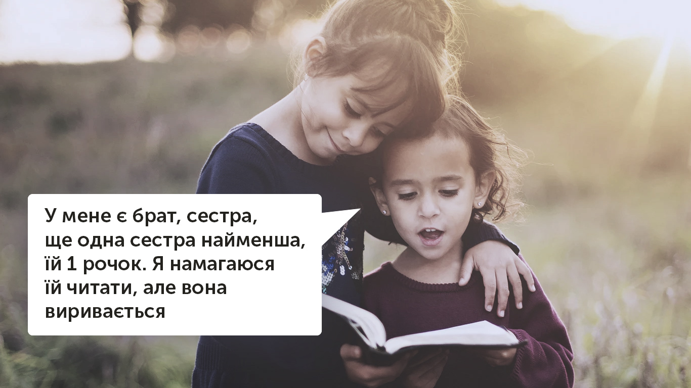 - У мене є брат, сестра, ще одна сестра найменша, їй один рочок. Я намагаюся їй читати, але вона виривається;