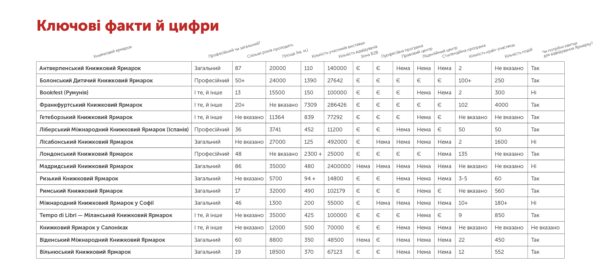 У звіті також вказані фокус-теми та цінності багатьох ярмарків. Серед тем, що превалюють — діалог та цифровий контент. В описі значної частини ярмарків вказано наявність дитячих програм чи особливе місце дитячого контенту. Зокрема, Ризький книжковий ярмарок тісно пов’язаний з освітою: серед професійних подій на ньому є окремі програми для вчителів та бібліотекарів, а паралельно з ним проходить виставка «Школа та освіта».