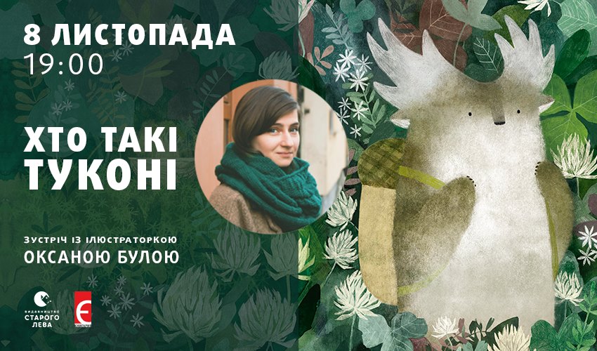 Книгарня «Є» (вул. Сумська, 3) та «Видавництво Старого Лева» запрошують на зустріч з ілюстраторкою Оксаною Булою, що відбудеться 8 листопада. Цього року у неї вийшла третя книжка з серії про лісових звірят «Туконі – мешканець лісу» у Видавництві Старого Лева. На зустрічі художниця розповість про те, як вигадала мешканців лісу – туконі, про що її книжки-картинки та новорічну книжку з серії, яка наразі готується до друку. Початок о 19:00. Модераторка – Rybka Olena.