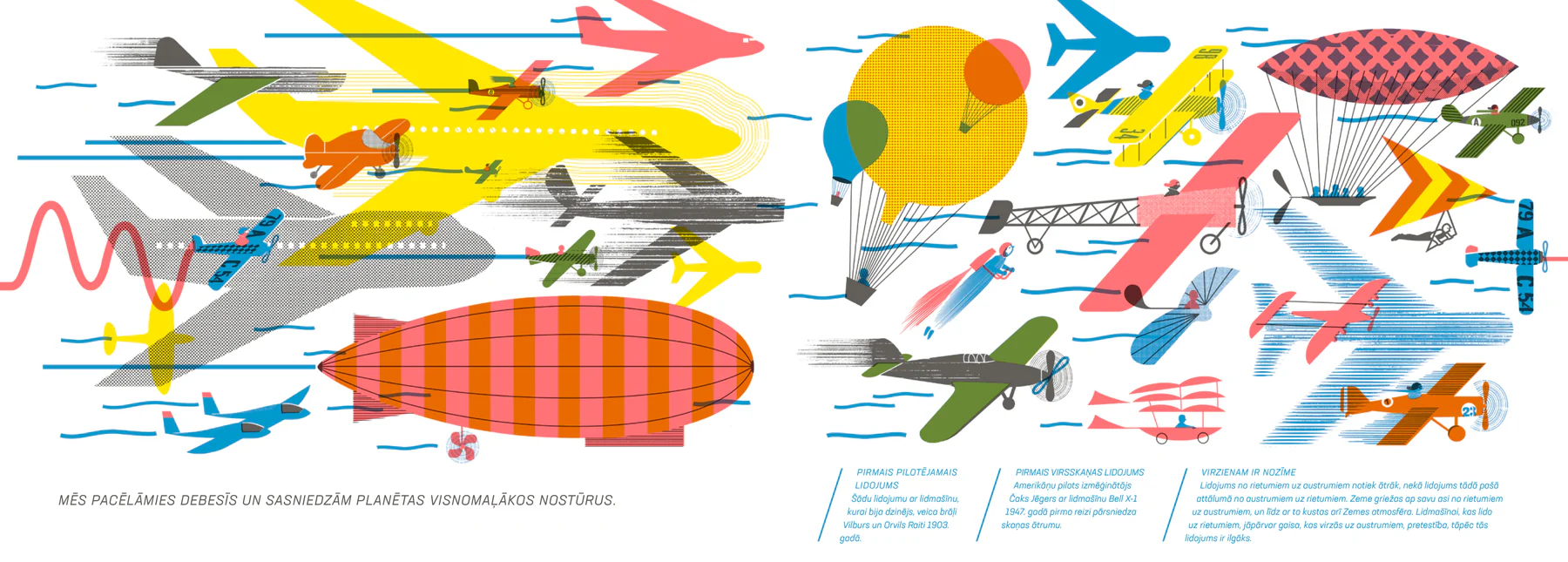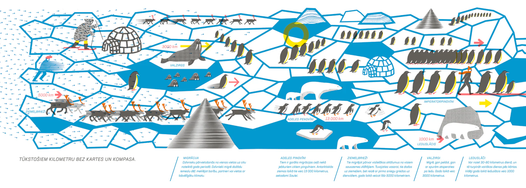 «“Куди і звідки” розповідає про рух і подорожі – не тільки людей, але й тварин, рослин, вітру, води та нашої планети. Вона розповідає про подорожі з метою торгівлі або завоювання, про подорожі заради задоволення та відпочинку або виживання, про наукові експедиції та паломництва. Про міграції, карти, навігацію і, нарешті, про пошук свого шляху», — йдеться в анотації до латвійського видання.